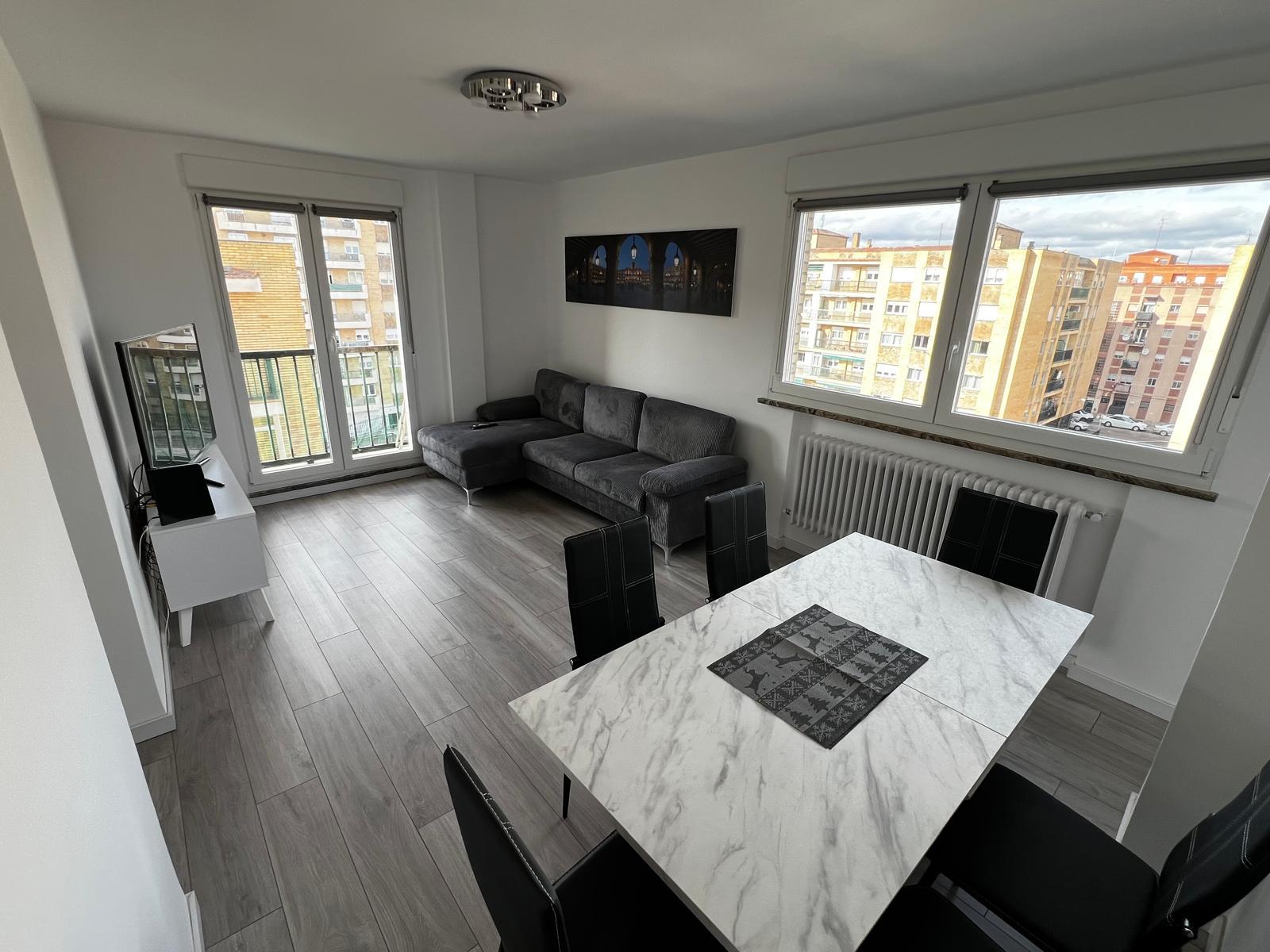 Salón-comedor con sofá chaise longue, mesa para 6 y TV de 55
